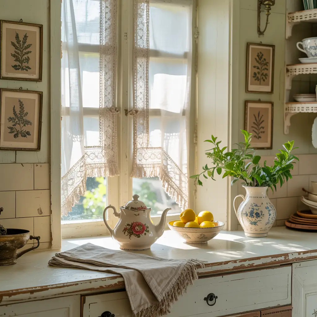 The embroidered details add texture and interest without overwhelming your space. Plus, they filter light beautifully, creating pretty shadows that dance across your countertops. Just avoid anything too frilly unless you’re going for full-on vintage vibes.