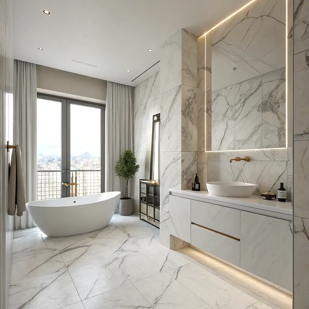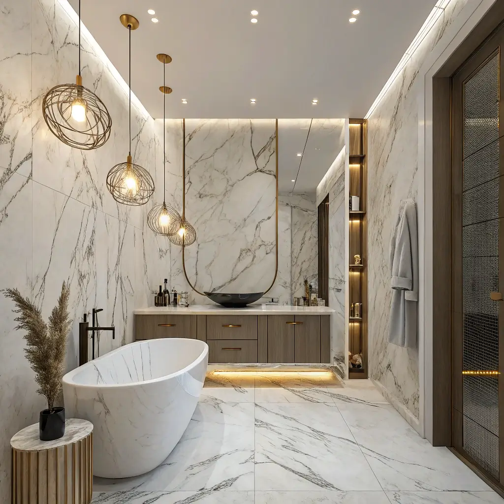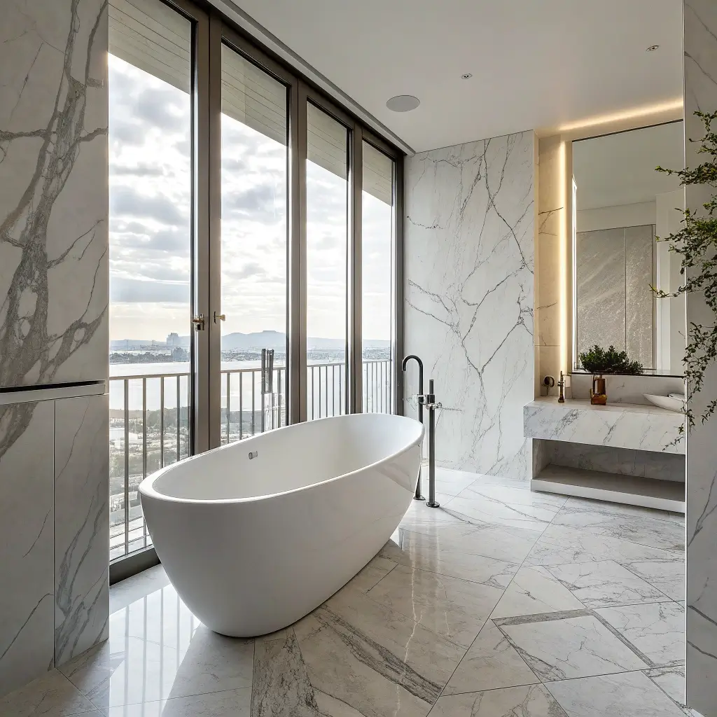 - Large-format marble tiles with minimal grout lines