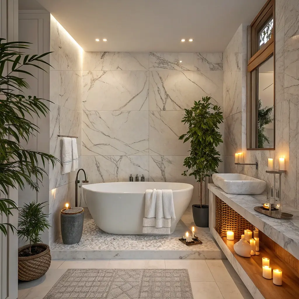 Modern tub designs paired with marble lean toward simplicity. Think geometric shapes, clean lines, and marble used strategically rather than everywhere. The tub itself becomes sculpture, while marble provides the perfect backdrop.
