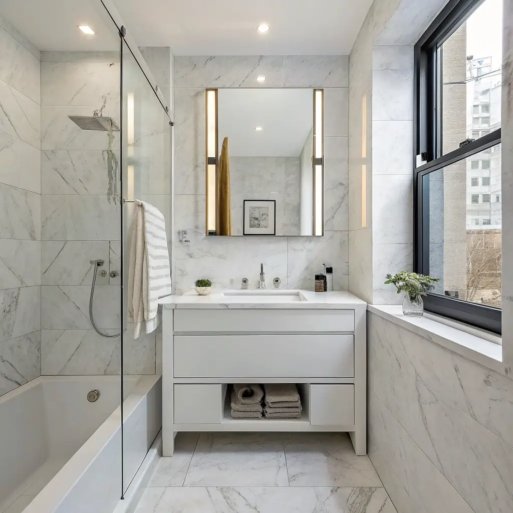Focus your marble budget on high-impact areas. Cover the floor and one accent wall – boom, instant luxury. Or go wild and marble everything (yes, even the ceiling if you’re feeling brave). The continuity actually makes small spaces feel larger because your eye doesn’t stop at different materials.