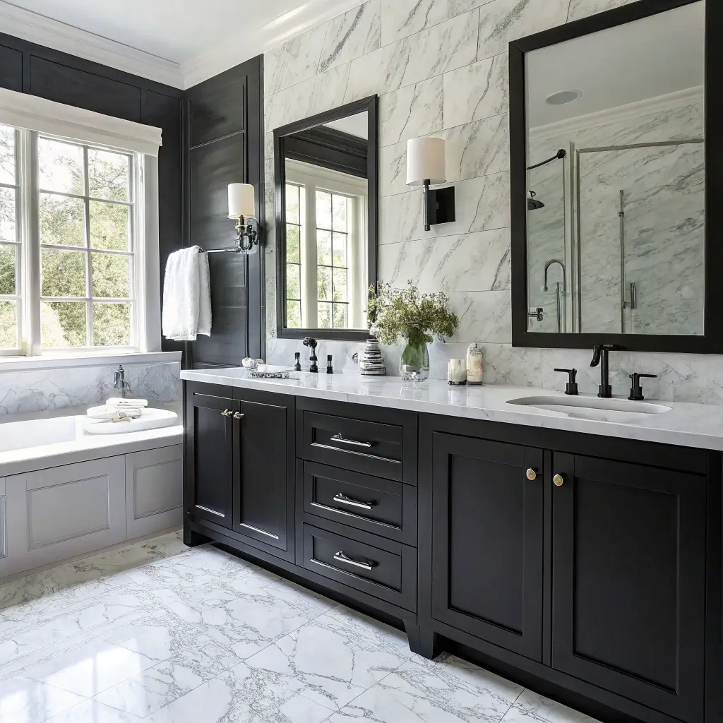 - Matte black fixtures against polished marble
