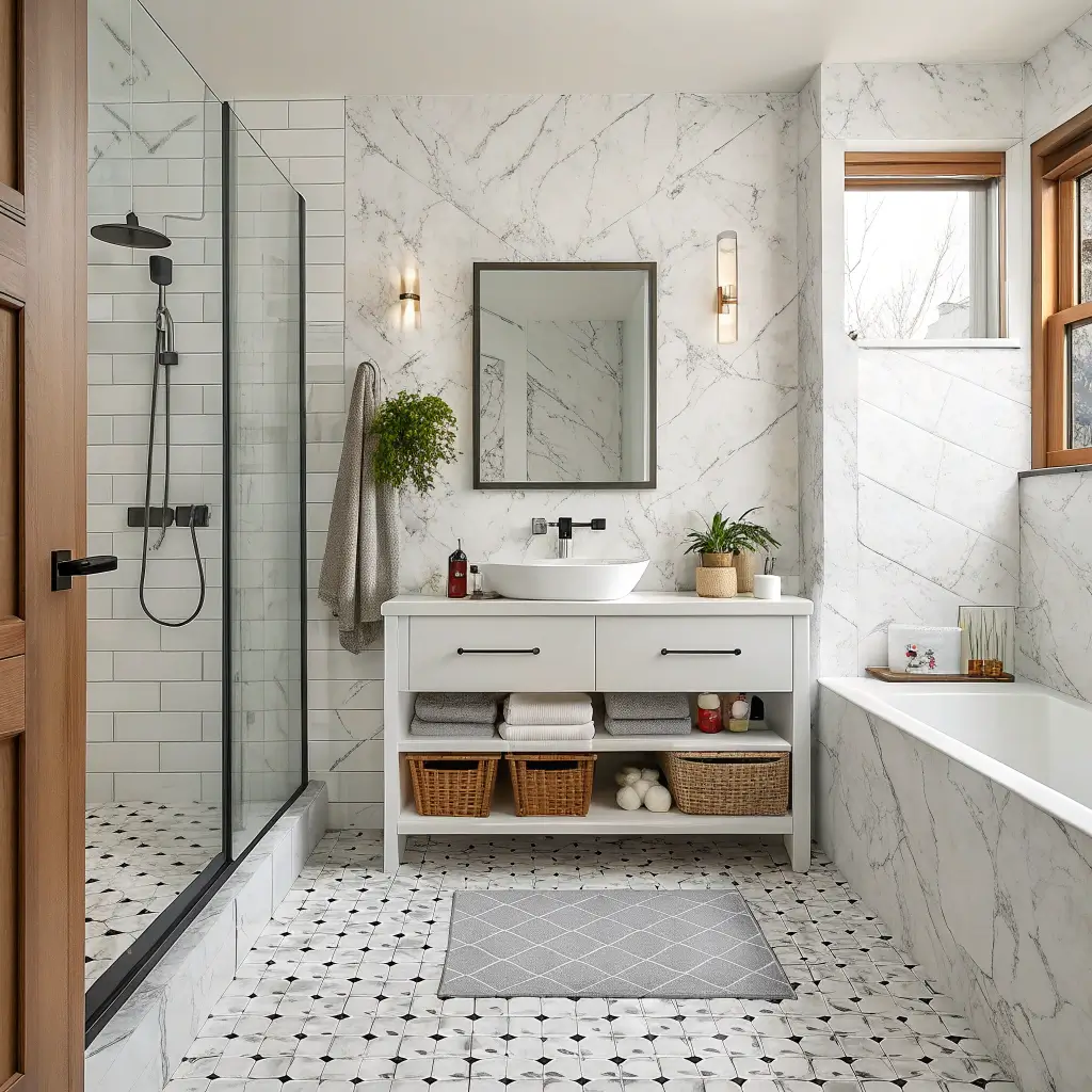 Patterned marble floors transform bathrooms into works of art. Whether you go for classic herringbone, modern geometric designs, or traditional basketweave, patterns add personality that plain tiles can’t match.