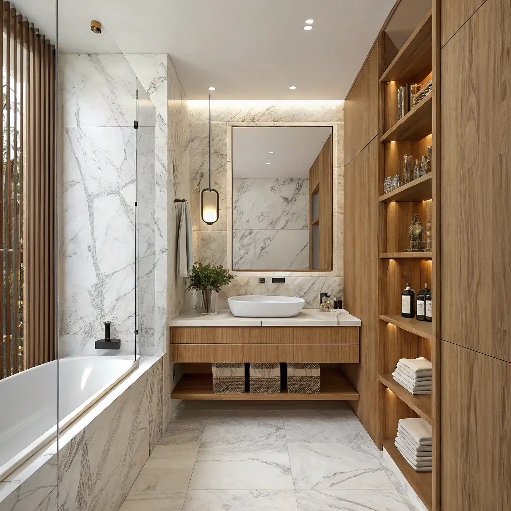 I stumbled into this combination by accident when I couldn’t afford to marble my entire bathroom. Added wood shelving out of necessity, and guess what? It looked intentional and designer-worthy. Sometimes the best designs come from working with what you’ve got.