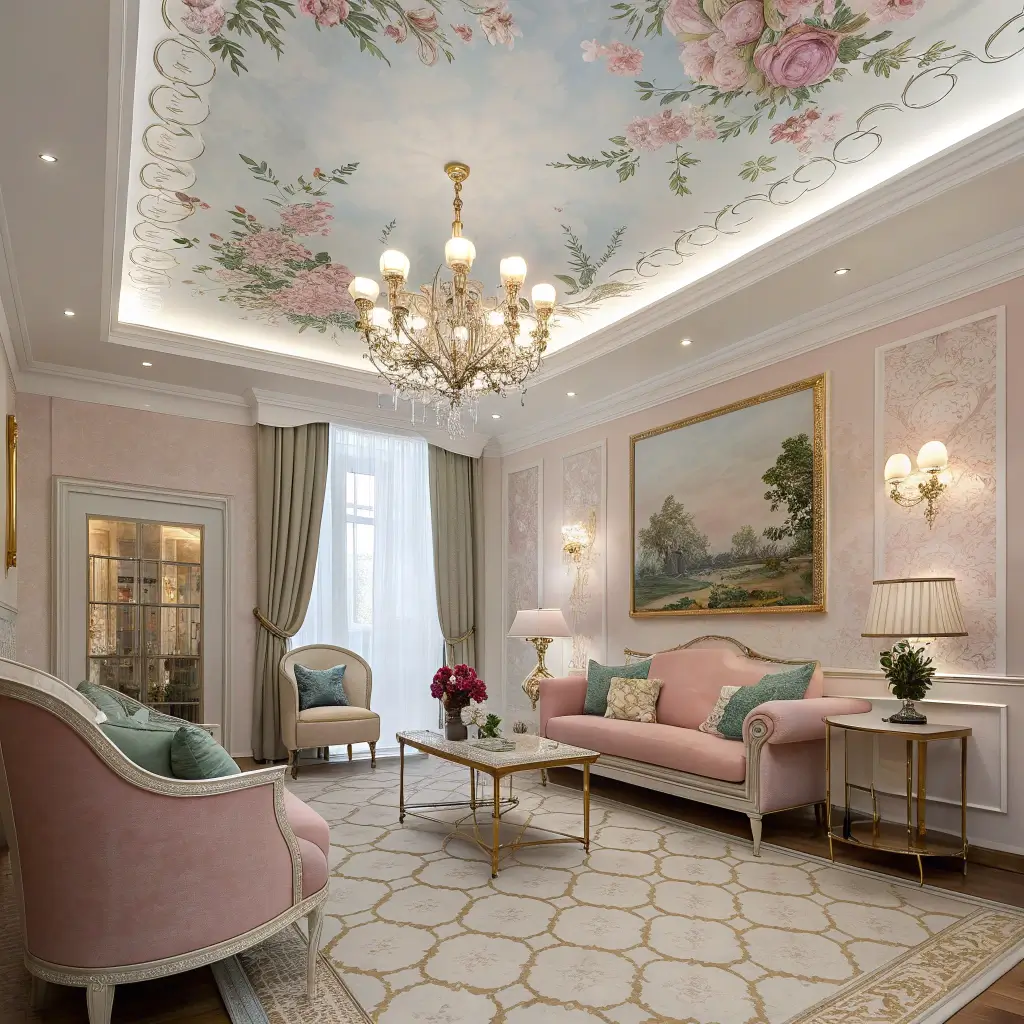 Floral Motif Ceiling with Hand-Painted Art