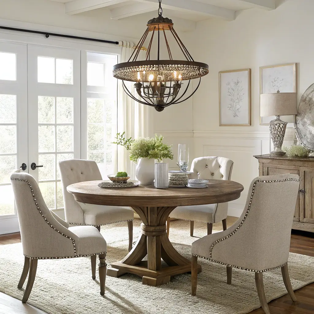 Want to know the secret to nailing the farmhouse look? Don’t go too matchy-matchy. Mix your rustic chandelier with some modern chairs or a sleek sideboard. The contrast keeps things interesting and prevents your dining room from looking like a Pinterest board exploded.