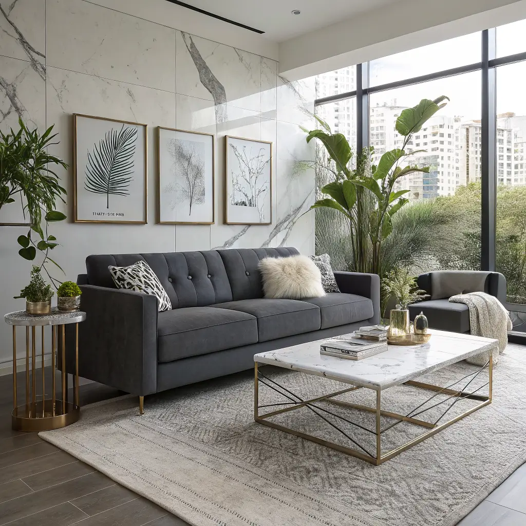 Going full monochrome with a charcoal couch as your starting point? This is sophistication at its finest, and it’s way easier to pull off than you might think. The secret is working with different shades and textures of gray, black, and white.