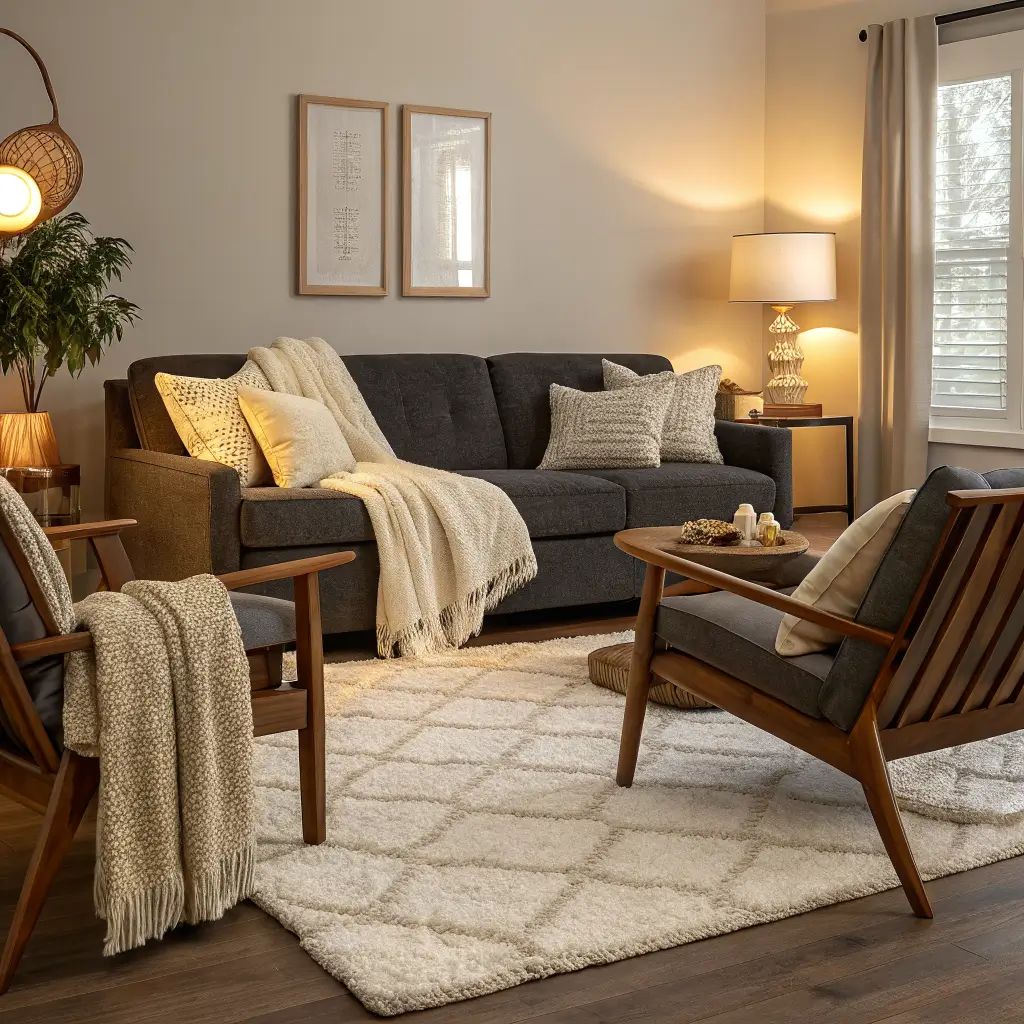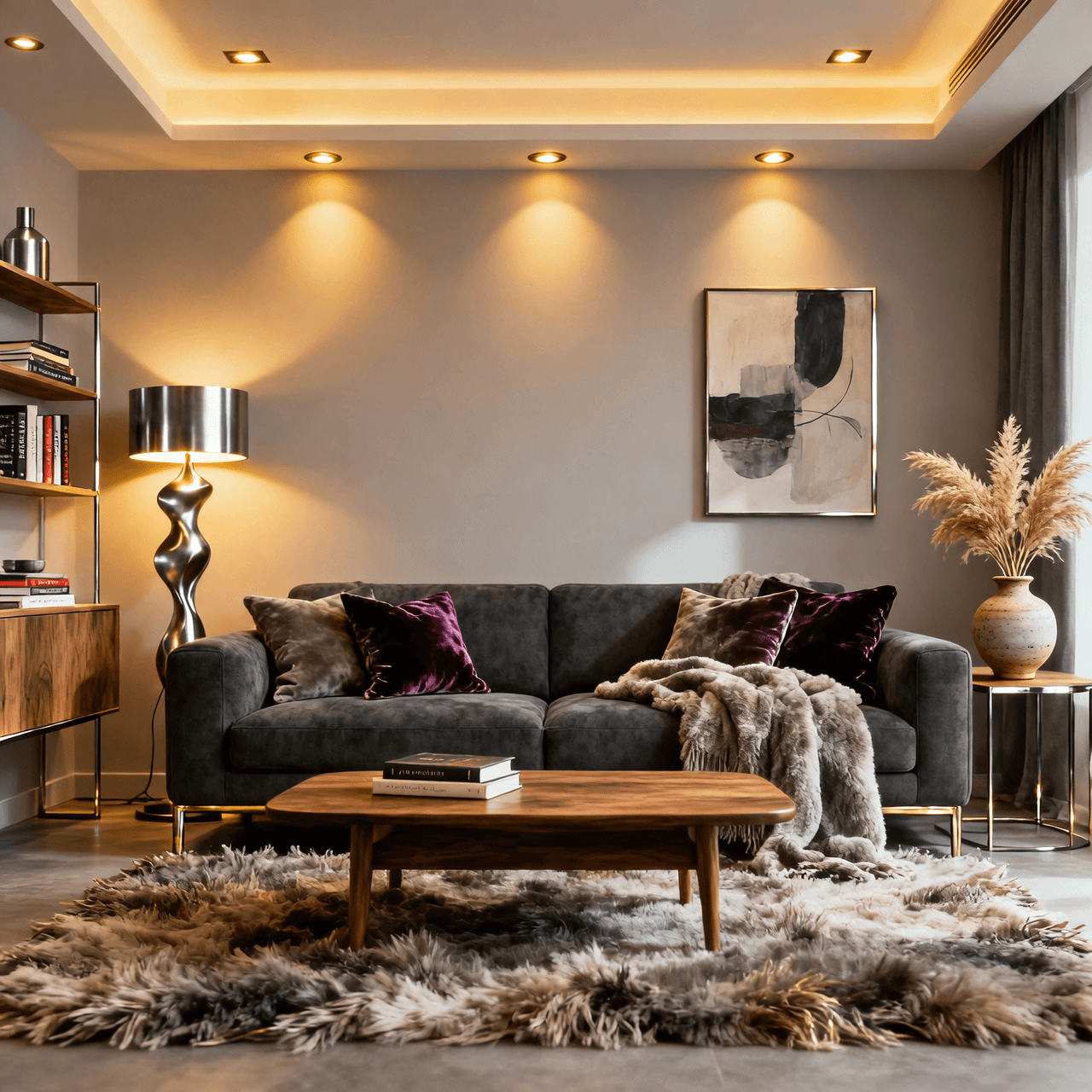 Here’s my go-to formula: always have at least three different textures visible from any angle. Your charcoal couch provides one (whether it’s microfiber, velvet, or leather). Add two more through accessories, and boom – instant designer look. The mix prevents your room from feeling flat or one-dimensional.