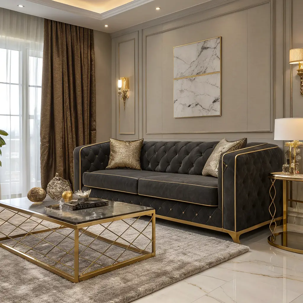Start with metallic accents â€“ and I’m talking rose gold, brass, or chrome, not your grandmother’s heavy gold fixtures. A sleek metal coffee table with glass top instantly elevates the space. Pair this with: