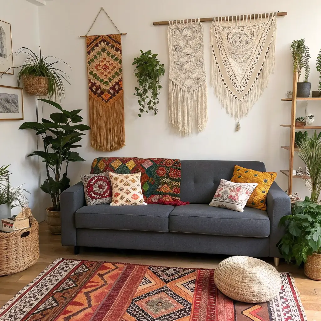 Here’s my formula: for every two decorative items, add one plant. Seriously, you can’t have too many plants in a boho space with a charcoal couch. The deep gray makes all that green pop like crazy. Plus, taking care of plants gives you something to do besides rearranging your throw pillows for the hundredth time (we all do it, don’t lie).
