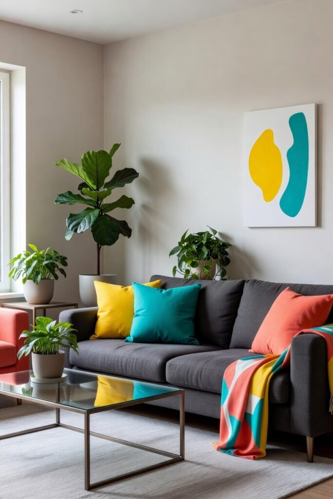 Follow the classic design rule: 60% neutral (your charcoal couch and walls), 30% secondary color (rug, curtains, large accessories), and 10% accent color (small pillows, vases, artwork). This formula keeps color from overwhelming your space while still making a statement.