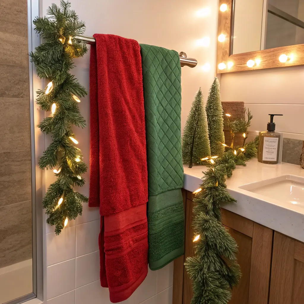 The game-changer? Coordinate your garland with your shower curtain. If you’ve got a red shower curtain, add red berries to the garland. Green curtain? Extra pine greenery. This coordination makes everything look intentional and pulled-together.