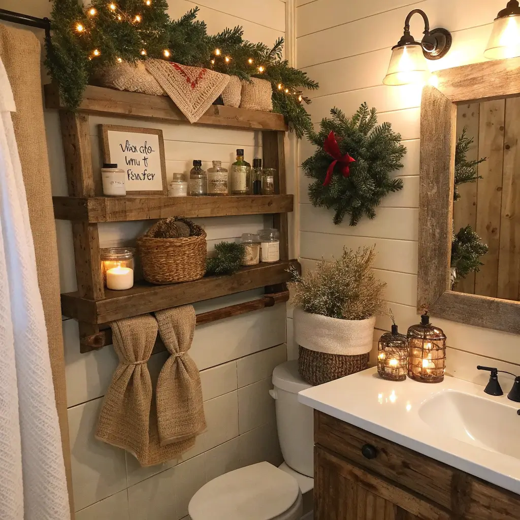 Buffalo plaid and burlap might sound like they belong in a barn, but hear me out. The rustic farmhouse Christmas look brings this cozy, welcoming vibe that makes even the smallest bathroom feel like a cabin retreat.