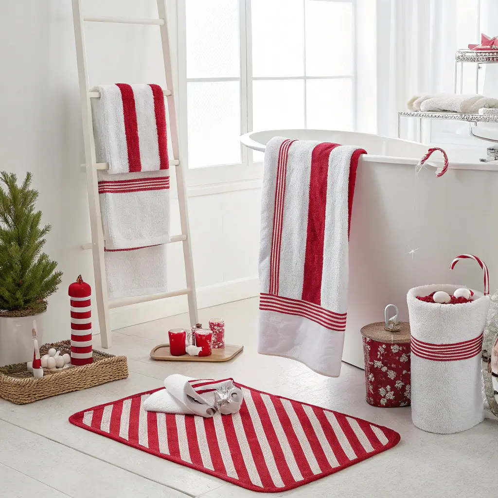 Start with a candy cane striped shower curtain. They’re everywhere right now, and you can snag one for under twenty dollars. Then layer in red and white striped hand towels, maybe a matching bath mat. The repetition creates this cohesive look that feels intentional rather than thrown together at the last minute.