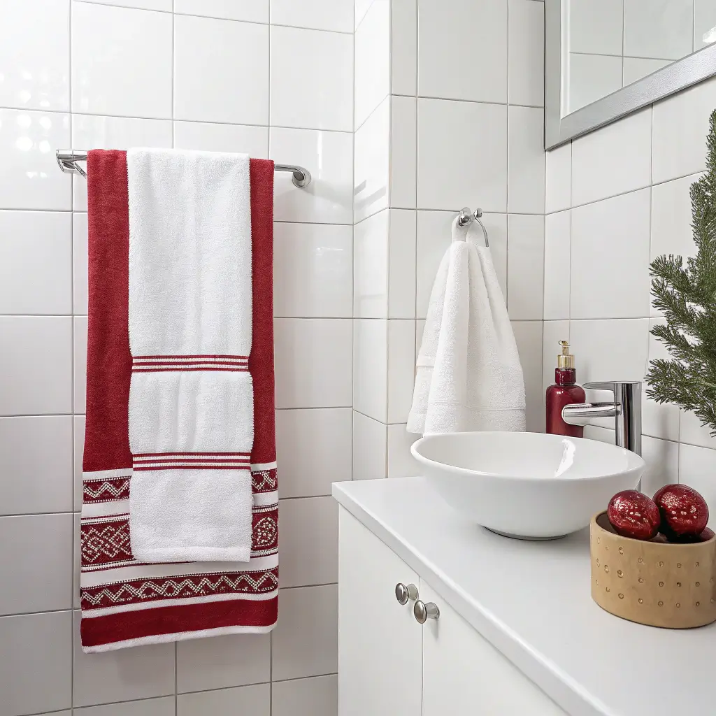 Let’s start with the easiest win you’ll get this season. Your towel rack sits there all year looking boring – why not give it some personality? I swap out my regular towels for rich red and forest green options about two weeks before December hits. Trust me, the early bird gets the best selection at HomeGoods.