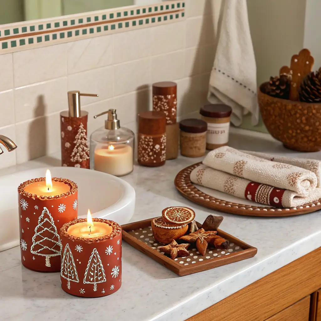 Create a candle corner on your vanity or a small shelf. Mix heights for visual interest – tall pillars, medium votives, tiny tealights. Choose festive scents if using real candles (though LED is safer): pine, cinnamon, sugar cookie. Arrange them on a mirror tray to amplify the glow.