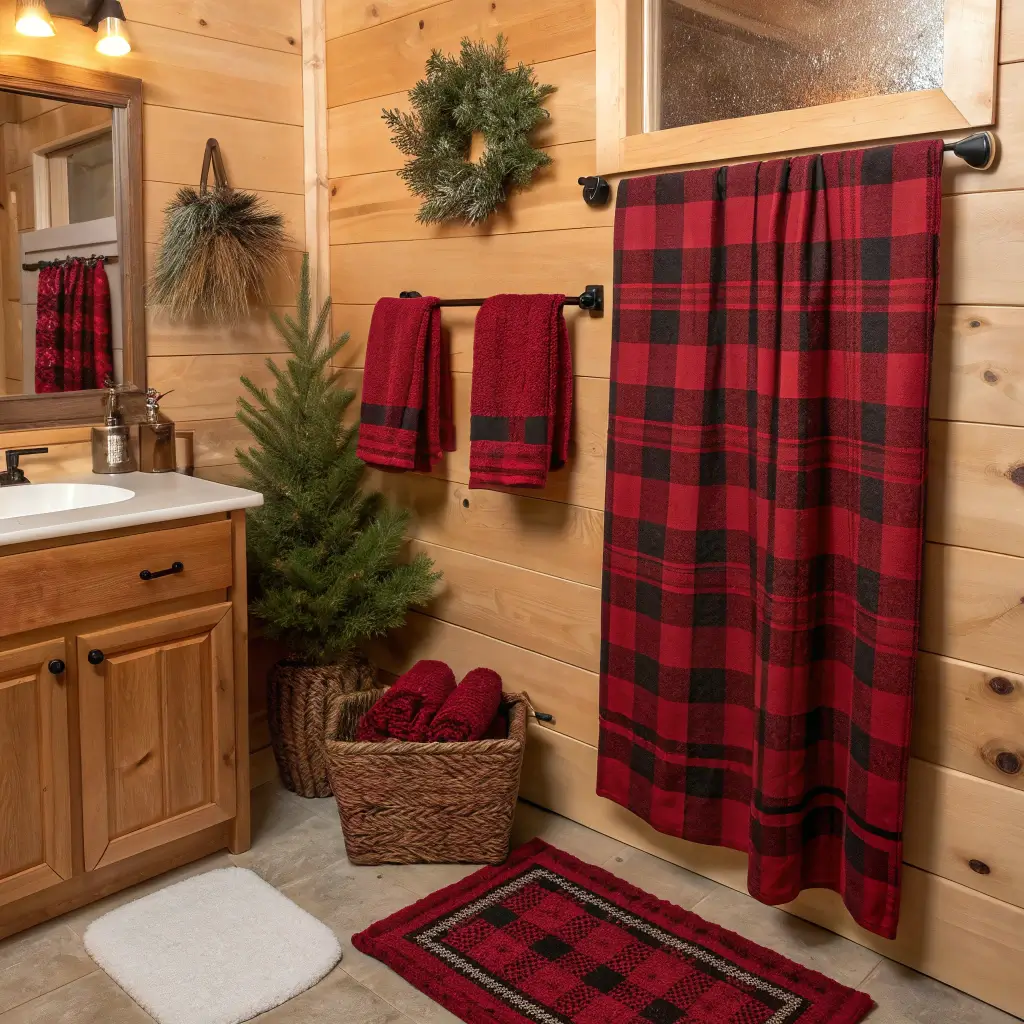 Pick one plaid pattern and stick with it throughout the space. I love a classic red and green tartan for shower curtains, then solid colors for towels that pull from the plaid. A matching plaid toilet seat cover might sound excessive, but trust me, it ties everything together beautifully.