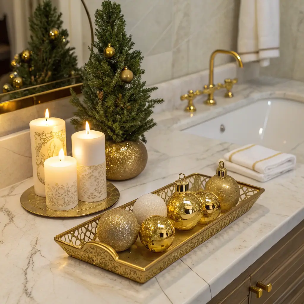 Replace your regular hardware with gold-toned pieces for the season. Okay, that sounds extreme, but hear me out – adhesive gold covers exist for drawer pulls and faucet handles. They peel right off after the holidays. Add gold-framed mirrors, gold soap dispensers, and suddenly your bathroom looks like it belongs in a fancy hotel.