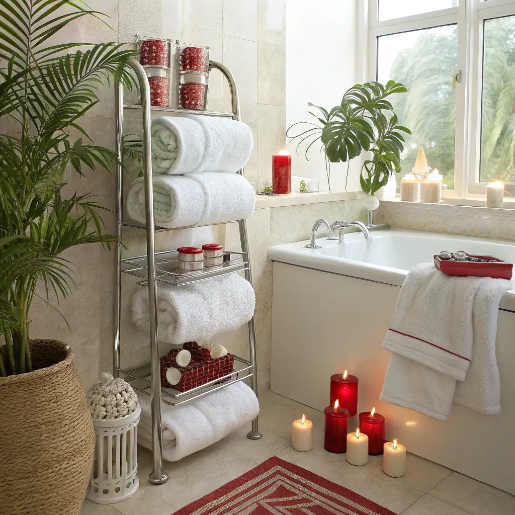 Choose one or two high-impact pieces in classic red and white. Maybe a single red vase with white branches, or white towels with a simple red ribbon detail. The magic happens in the restraint – every item you choose needs to earn its place. No random Santa figurines just because they were on sale.