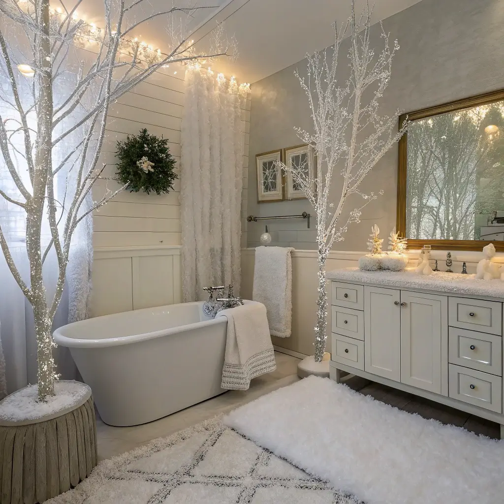 Start with white everything – white towels, white shower curtain, white rugs. Then add silver accents: silver ornaments in bowls, silver tinsel draped strategically, silver snowflake clings on the mirror. The monochromatic palette creates this serene, snowy atmosphere.