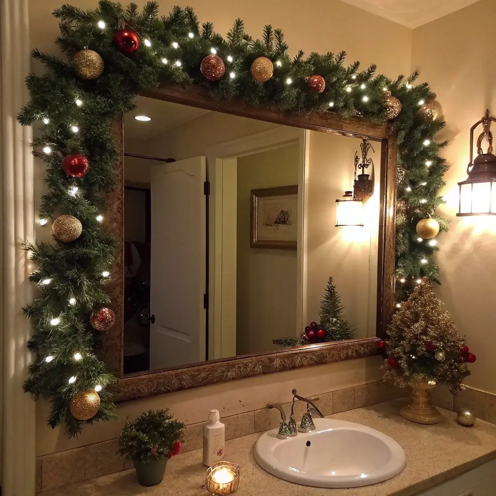 Quality artificial garland looks amazing these days. Weave it around your mirror frame, securing with clear command strips. Add some battery-operated lights (the tiny wire ones work best), and maybe a few small ornaments. The reflection doubles the visual impact, making your bathroom look twice as festive.