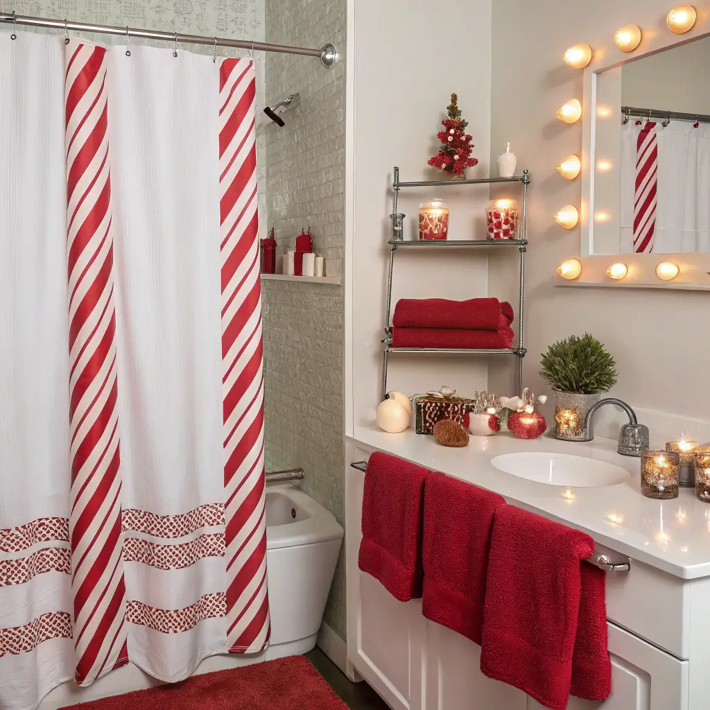 Start with striped shower curtains – they set the entire mood instantly. I found mine at Target for under $20, and honestly, it changed everything. Add red and white hand towels alternating on your towel bars for that authentic candy cane vibe. Want to kick it up a notch? Replace your regular soap dispenser with one shaped like a candy cane or fill a clear dispenser with red and white striped soap.