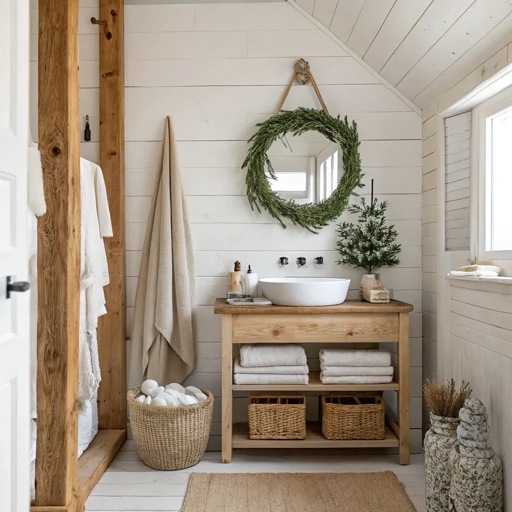 White walls, natural wood accents, and simple red hearts or stars as decorations nail this aesthetic. Minimalist wreaths made from eucalyptus or pine, tied with simple twine or white ribbon, look stunning against white tiles. Add cozy elements like knitted toilet paper covers (yes, they exist and they’re adorable) or a small wooden stool with folded blankets.