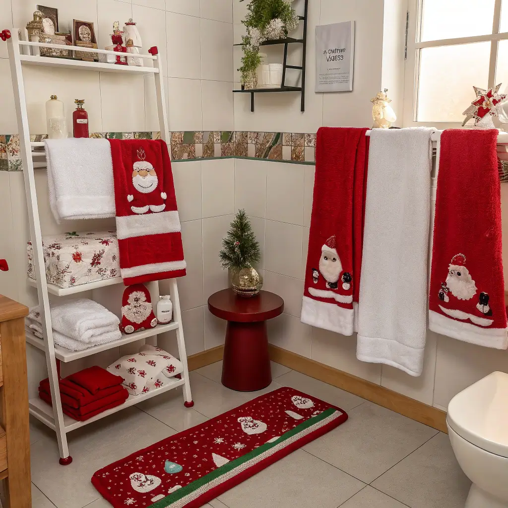 Focus on sophisticated Santa elements – vintage Santa prints, elegant red and white color schemes, and subtle nods rather than inflatable Santas everywhere. A Santa hat on the toilet paper holder? Cute. Santa toilet seat cover, Santa bath mat, AND Santa shower curtain? Maybe too much.