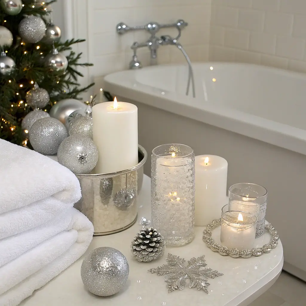 Metallic silver accessories catch light beautifully – think soap dispensers, tissue holders, and waste baskets. Add silver tinsel garland sparingly around mirrors or light fixtures. Silver and white towels, crystal-clear containers filled with silver ornaments, and mercury glass candle holders create layers of elegance.