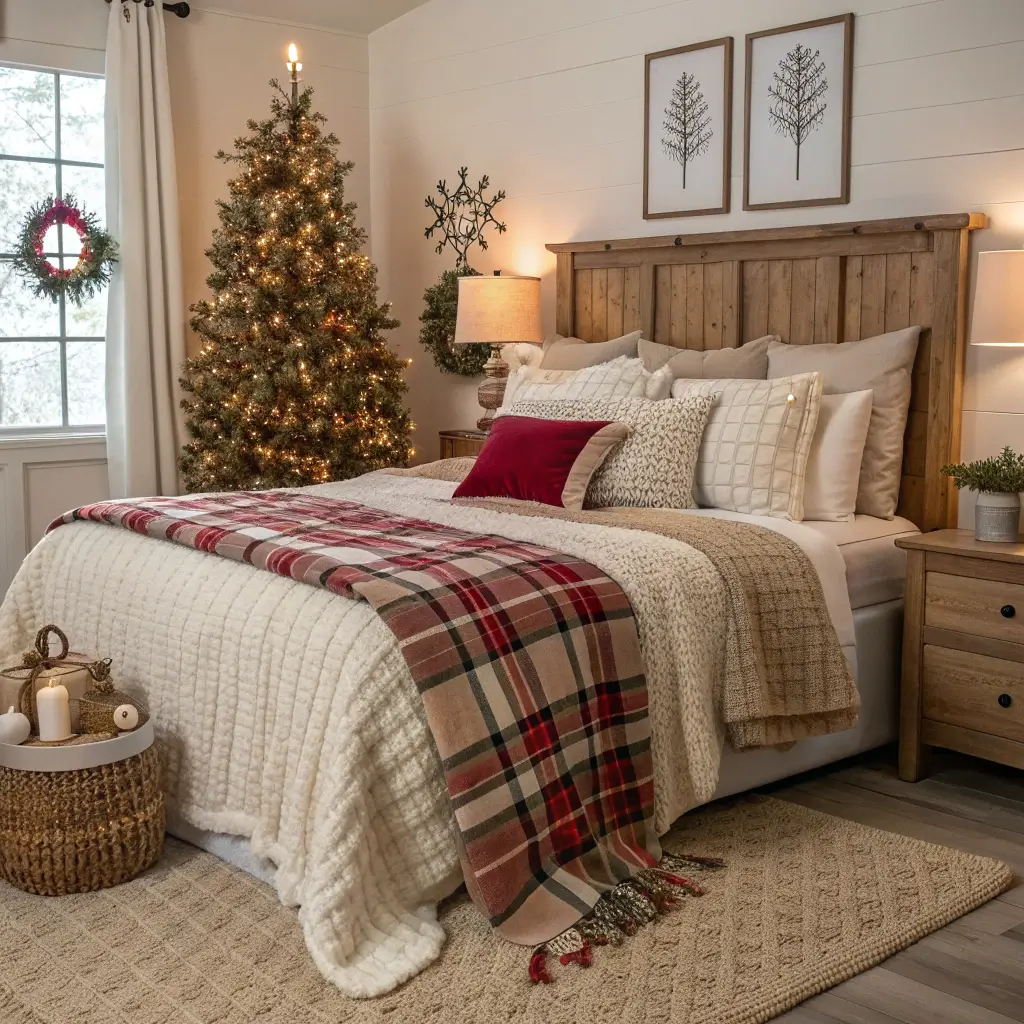 Nothing says “cozy Christmas cabin” quite like plaid patterns and chunky knits. This is the bedroom style that makes you want to wear flannel pajamas and wool socks 24/7, and honestly, I’m not mad about it.