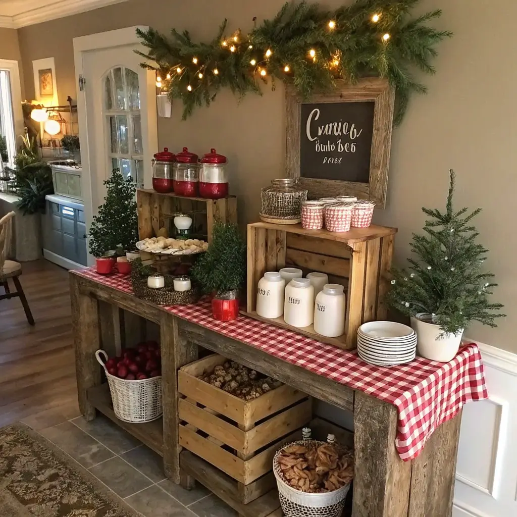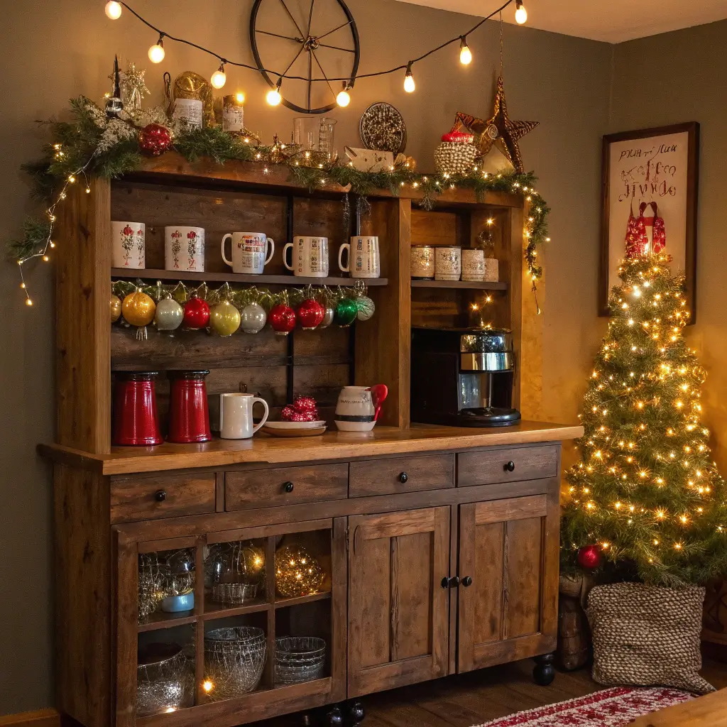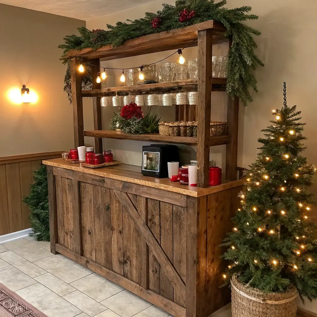 Nothing says “cozy Christmas morning” quite like weathered wood paired with holiday touches. I discovered this style completely by accident when I repurposed an old barn door as a backdrop for my coffee station.