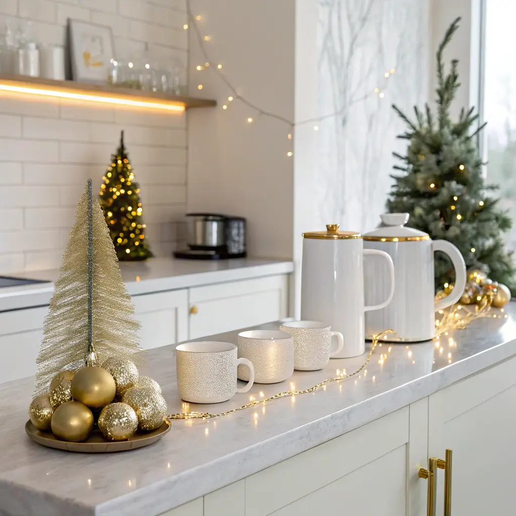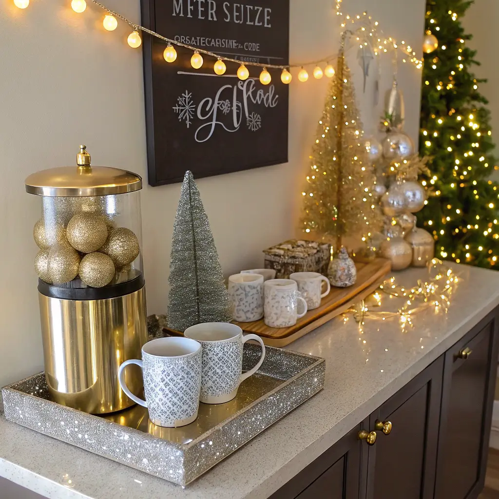 Start with metallic everything – gold, silver, rose gold, or all three. Add glittered ornaments, sequined table runners, and crystal-like accessories. Your coffee bar should look like it belongs at a fancy hotel.