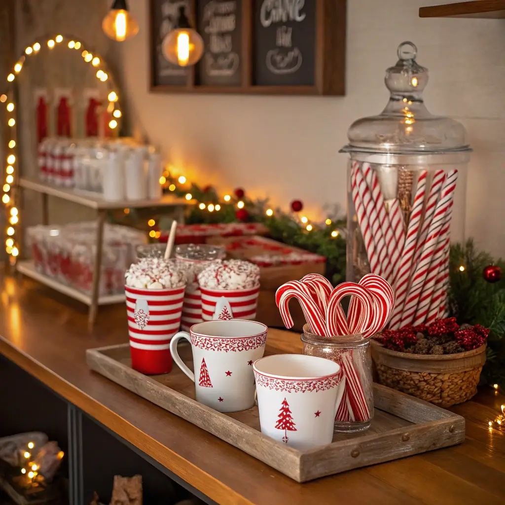 Go all in with red and white stripes everywhere. Striped mugs, striped straws, even a striped table runner. Add actual candy canes as stirrers, crushed peppermint toppings, and peppermint syrup for flavoring.
