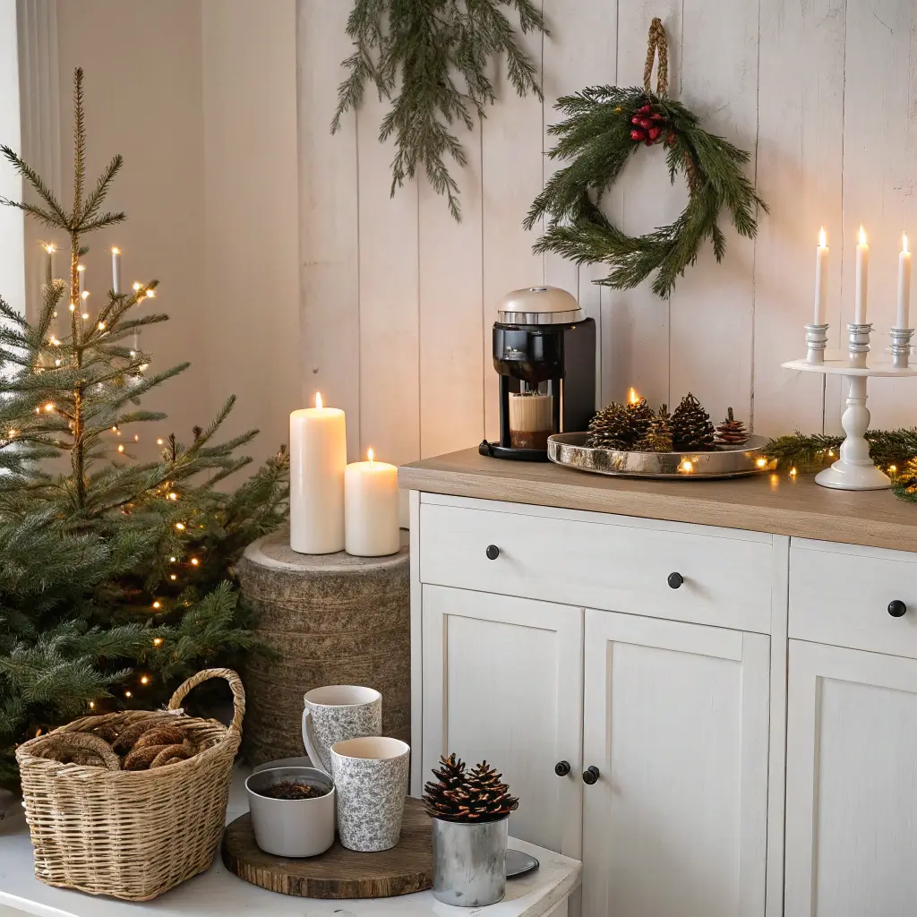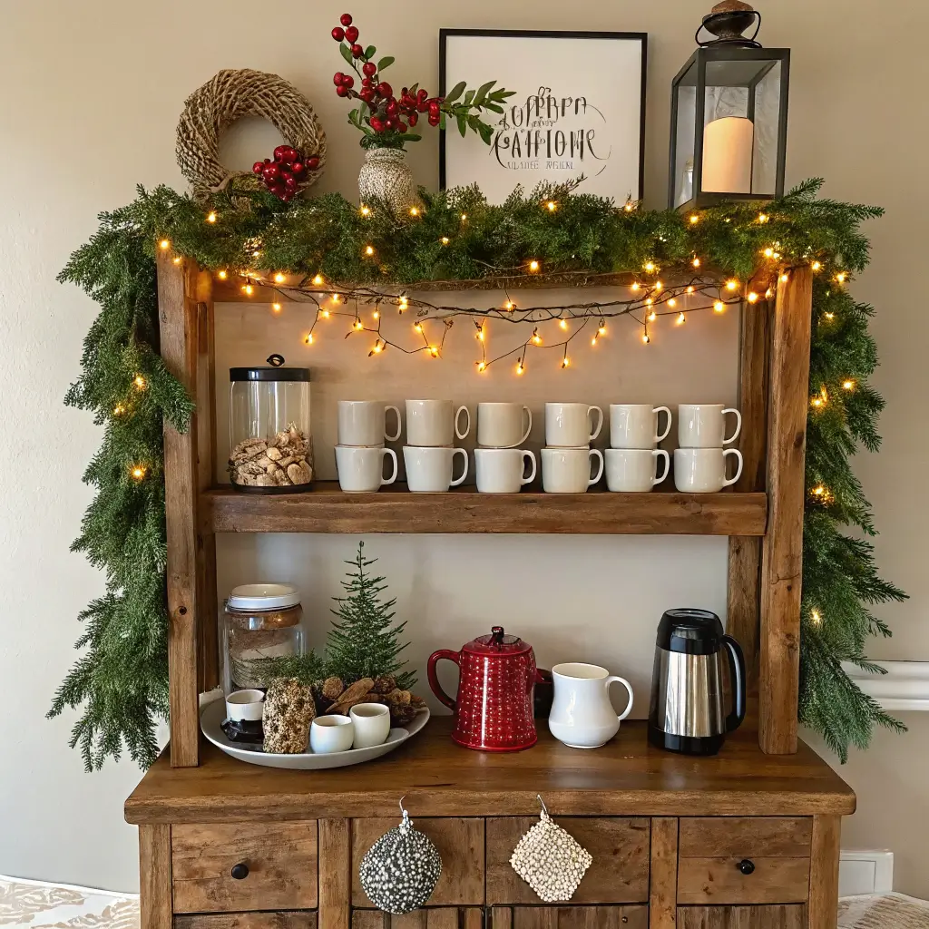 Drape lush evergreen garland across the front of your coffee bar, around shelving, or create a backdrop. Mix in white lights, pinecones, and maybe some red berries for color.
