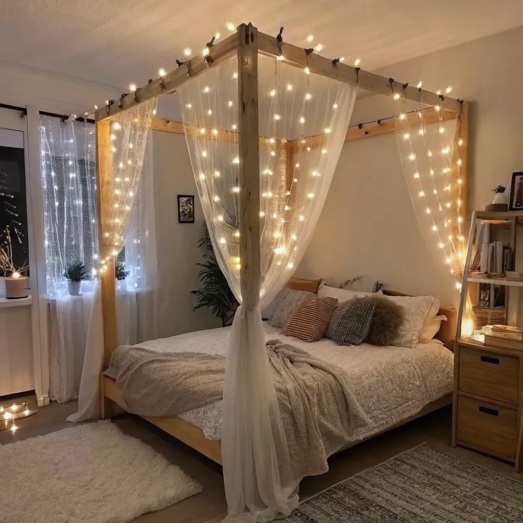 Here’s what makes this setup incredible. You drape sheer curtains or fabric from the ceiling, then weave fairy lights through them. The effect? Pure magic. I used about 300 warm white LED lights for my queen-sized bed, and the soft glow creates this dreamy atmosphere that makes me never want to leave.