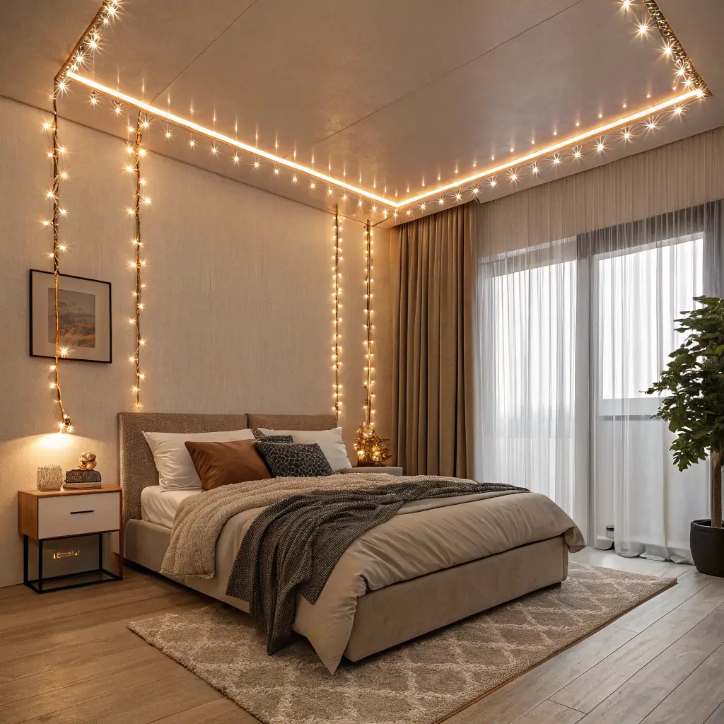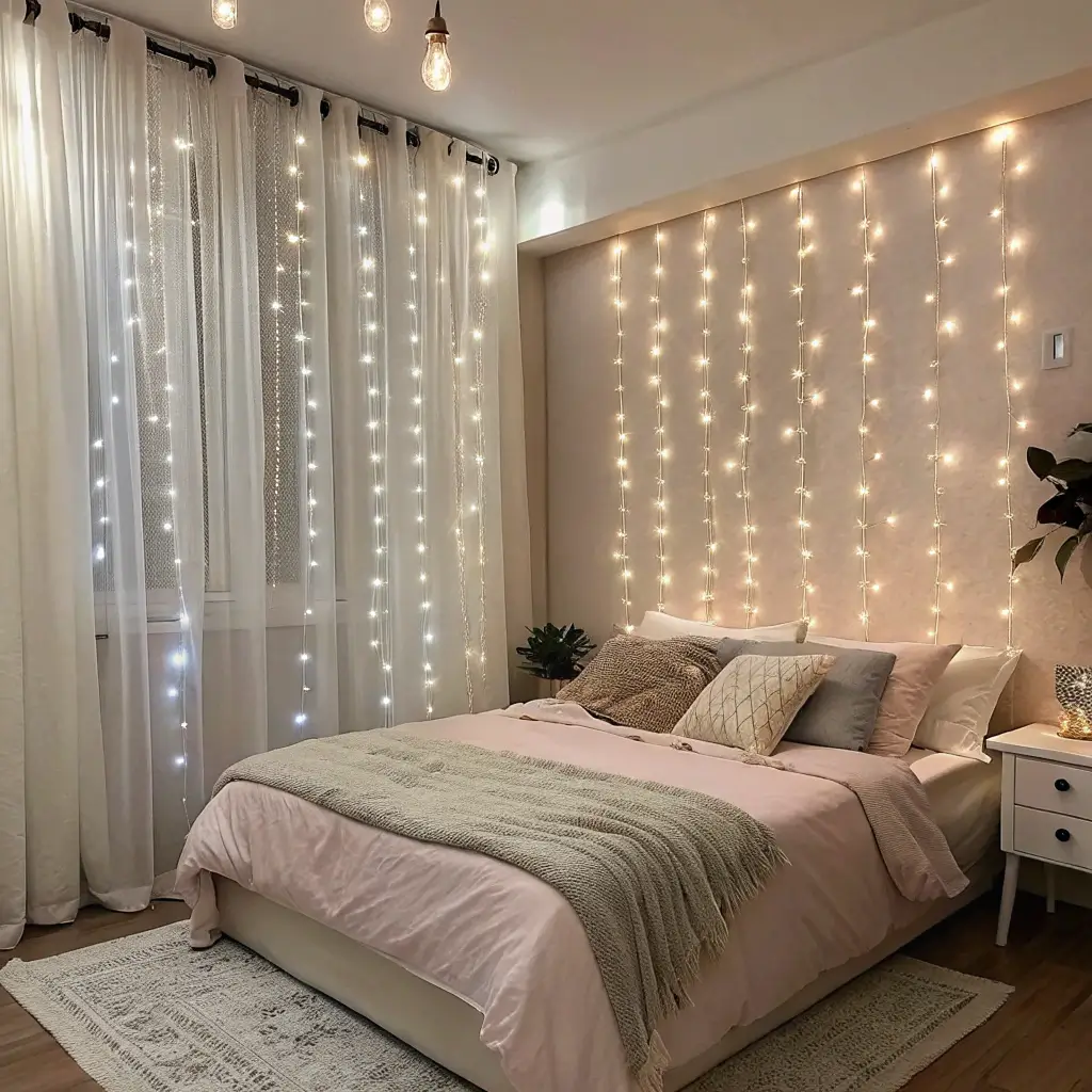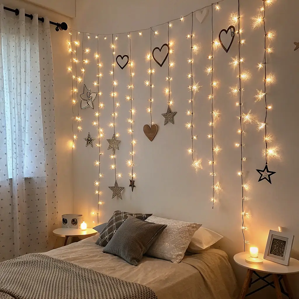 These lights hang vertically like a waterfall of stars. Position them between your headboard and the wall, and boom – instant atmosphere. The soft illumination creates depth and makes your bed the focal point of the room.