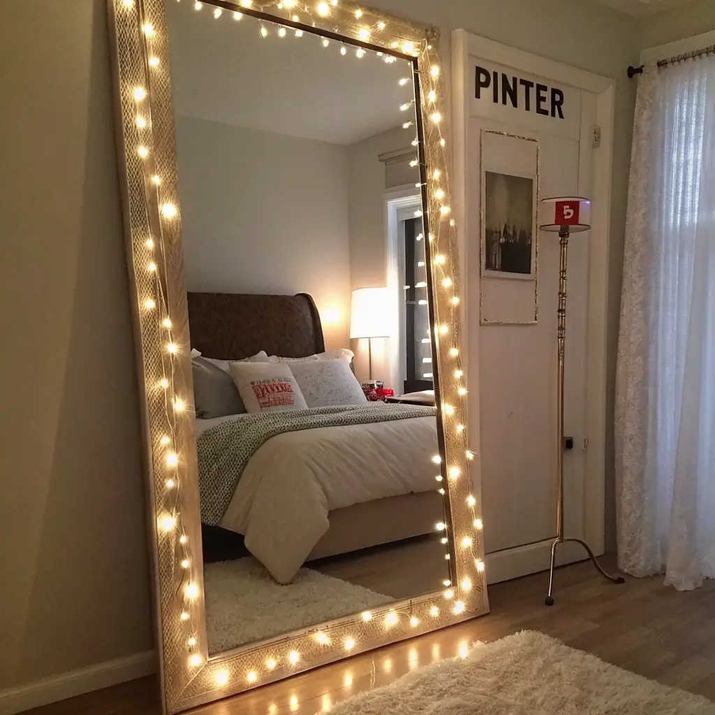 Every bedroom needs a mirror, but why settle for boring when you can have spectacular? Framing your mirror with Christmas lights creates this Hollywood vanity vibe that makes getting ready feel like preparing for the red carpet. I added lights to my full-length mirror, and now my morning routine feels way more glamorous.