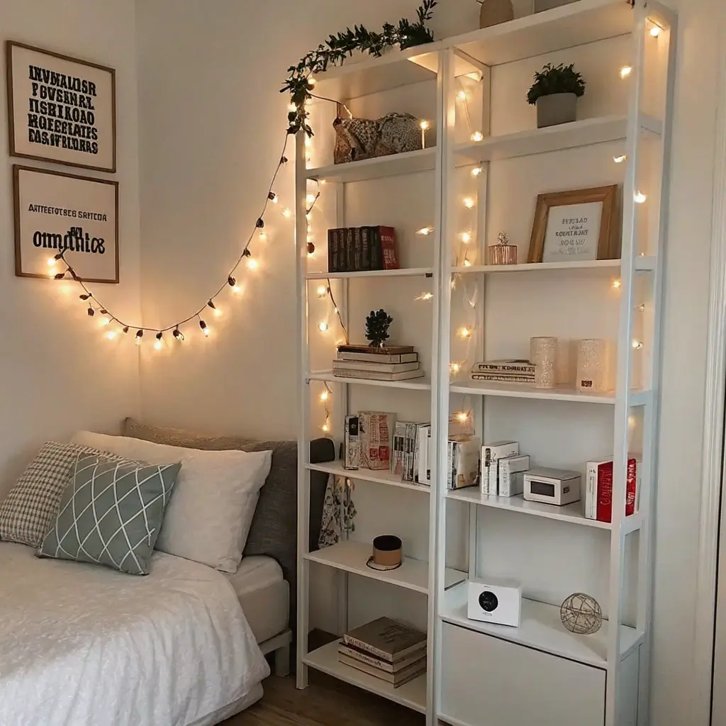 Got shelves in your bedroom? Then you’ve got prime real estate for Christmas lights. Running warm white lights along shelf edges creates this floating effect that makes your displays look museum-worthy. My book collection has never looked better, honestly.