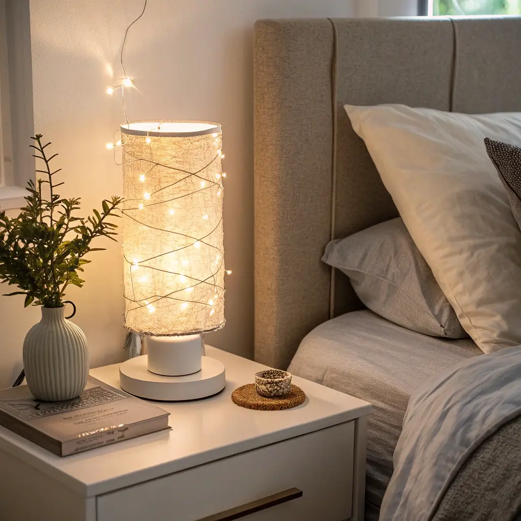 Who says table lamps and Christmas lights can’t be friends? Wrapping mini string lights around your bedside lamp base creates this hybrid lighting solution that’s both practical and whimsical. I did this with my boring IKEA lamp, and now it looks like something from a boutique hotel.