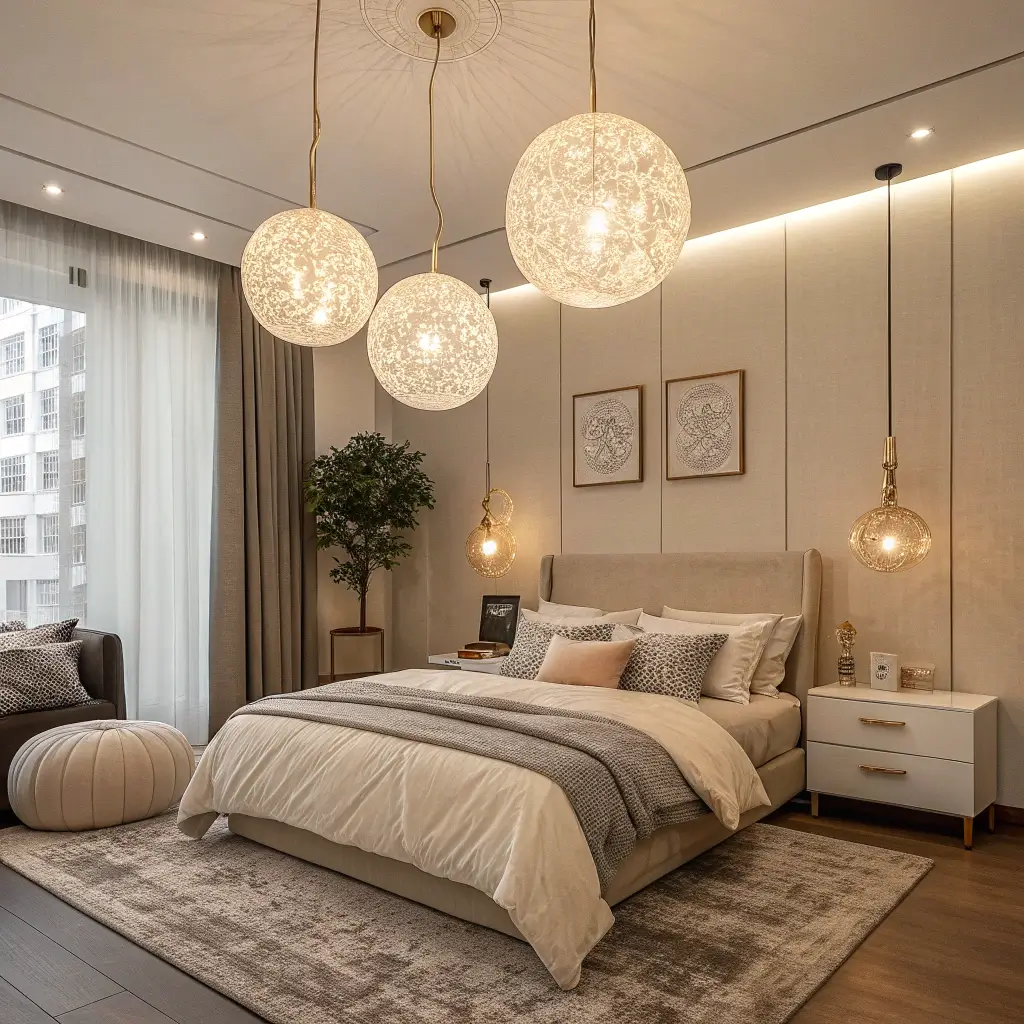 Last but definitely not least, globe lights create this bistro-style ambiance that makes your bedroom feel like a cozy outdoor café. I hung mine in a zigzag pattern across my ceiling, and now every night feels like a dinner party (except I’m in pajamas eating cereal).