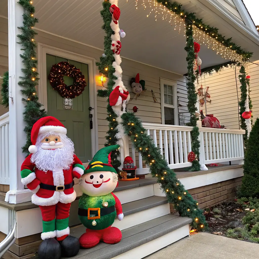 Life-sized Santa and elf figures are your starting point. Position Santa near your door like he’s about to knock, maybe holding a gift bag. Place elves peeking out from behind planters or sitting on railings. The key is creating scenes that tell a story. Make it look like Santa’s crew just landed for a quick break.