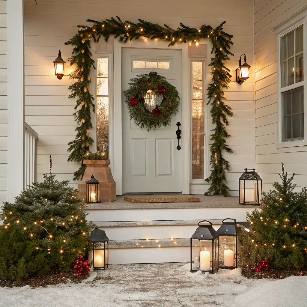 White wreaths with eucalyptus are having a major moment right now. Hang one on your door and maybe add a simple white bow. No glitter, no tinsel, just pure elegance. Place two matching white lanterns on either side of your door, pop in some battery-operated candles, and you’re basically done.