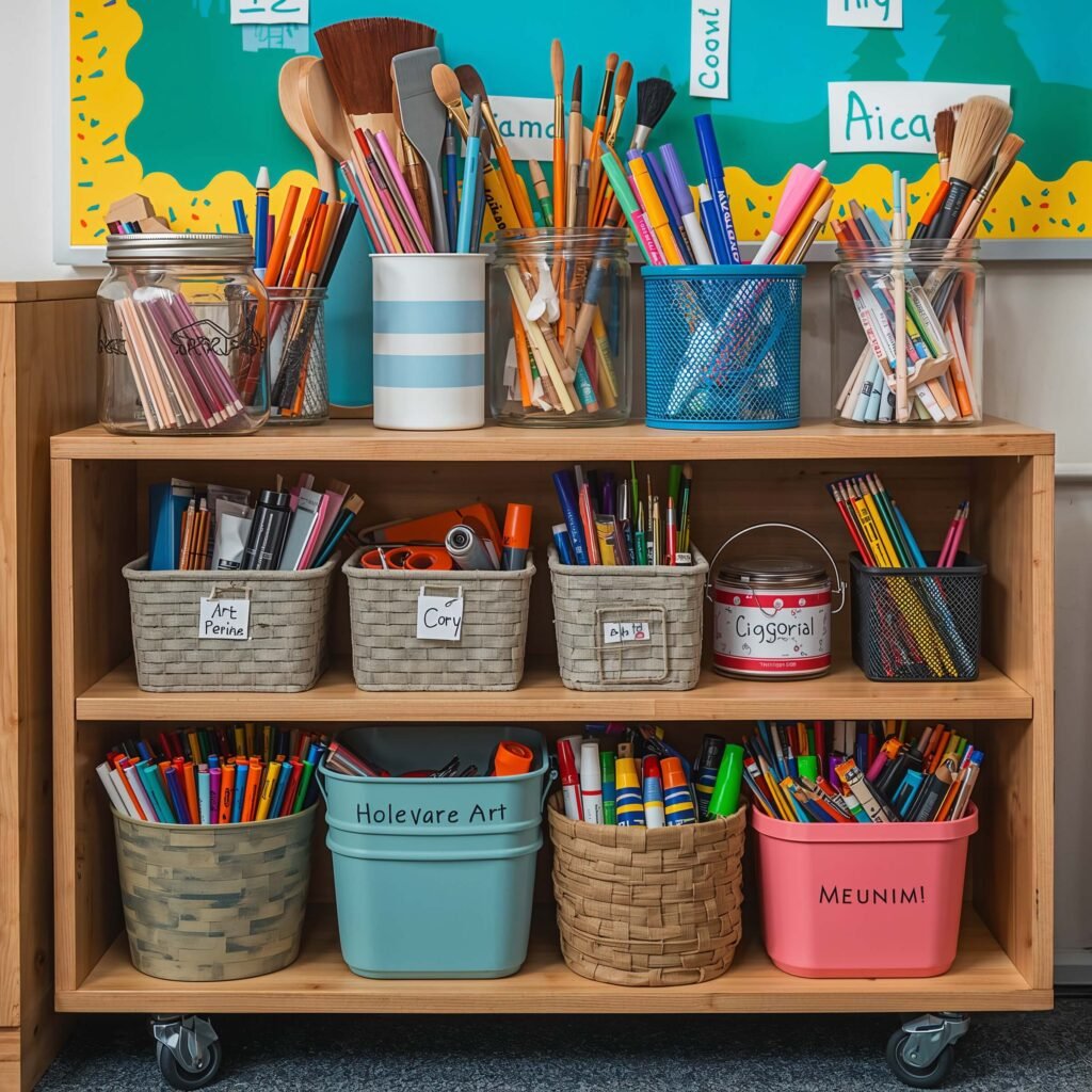Group similar supplies together but use different container styles for visual variety. My marker section looks like a rainbow explosion with graduated jar sizes creating a cascading effect. Students actually put supplies back where they belong because the system makes sense visually.