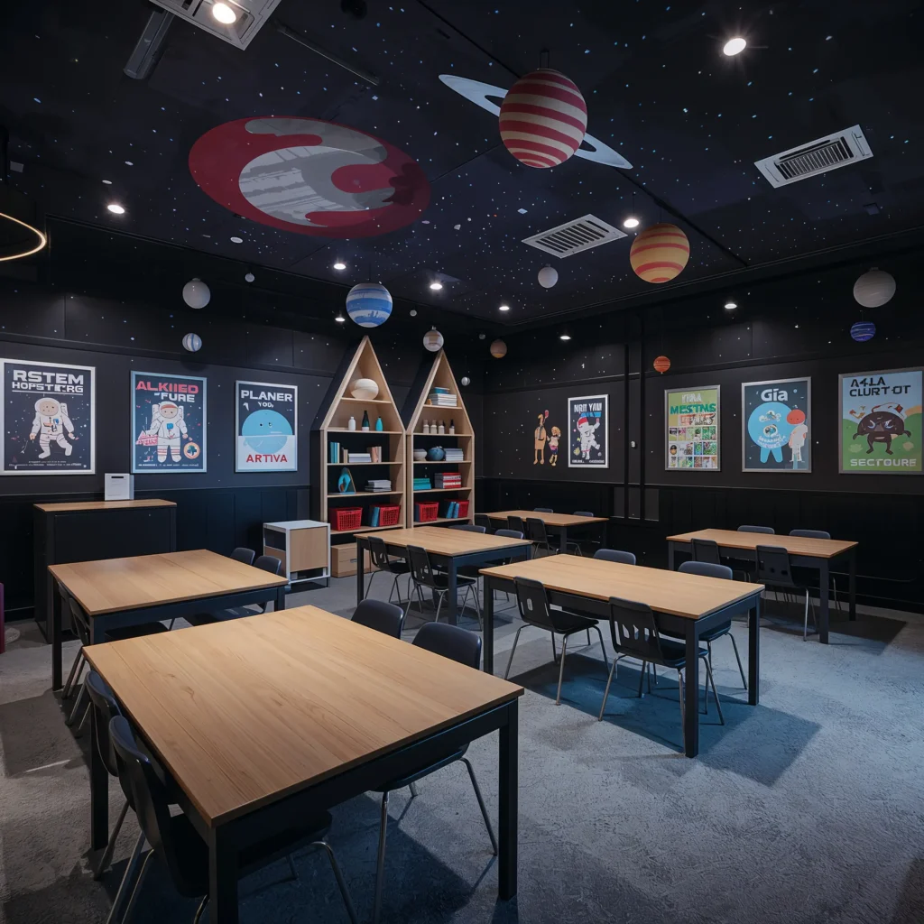 Mount a “Mission of the Week” board where you post learning objectives as space missions. “Mission: Master multiplication tables by Friday” sounds way cooler than regular homework assignments. Create astronaut badges for different achievements – kids wear them on lanyards and collect them throughout the year.