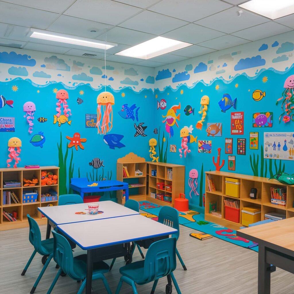 String up fishing nets in corners (you can get these super cheap at party stores) and fill them with beach balls painted like puffer fish, paper sea creatures, and even some shiny “treasure.” Kids love spotting new additions throughout the year.