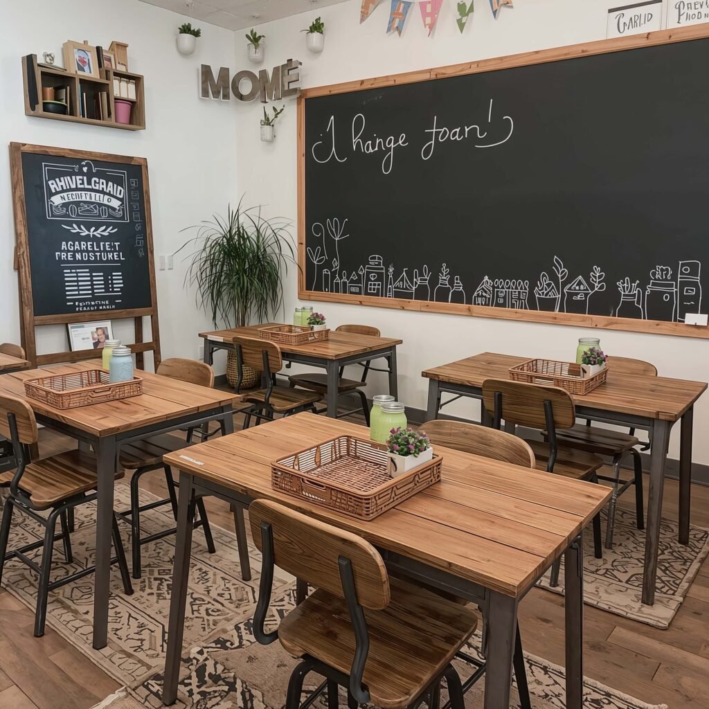Mix in wood elements wherever possible. Use wooden crates as book storage, mount clipboards on the wall for displaying work, and add a rustic wooden sign with your classroom rules. Hit up garage sales for old wooden frames – paint them white and distress them slightly for that authentic farmhouse look.