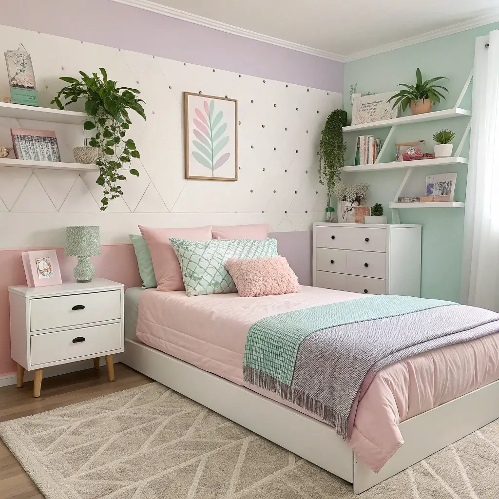 First rule of pastel club: pick your palette and stick to it religiously. I chose sage green, soft lavender, and butter yellow. Three colors, max. Any more and you risk looking like a unicorn exploded in your room (not the vibe we’re going for).
