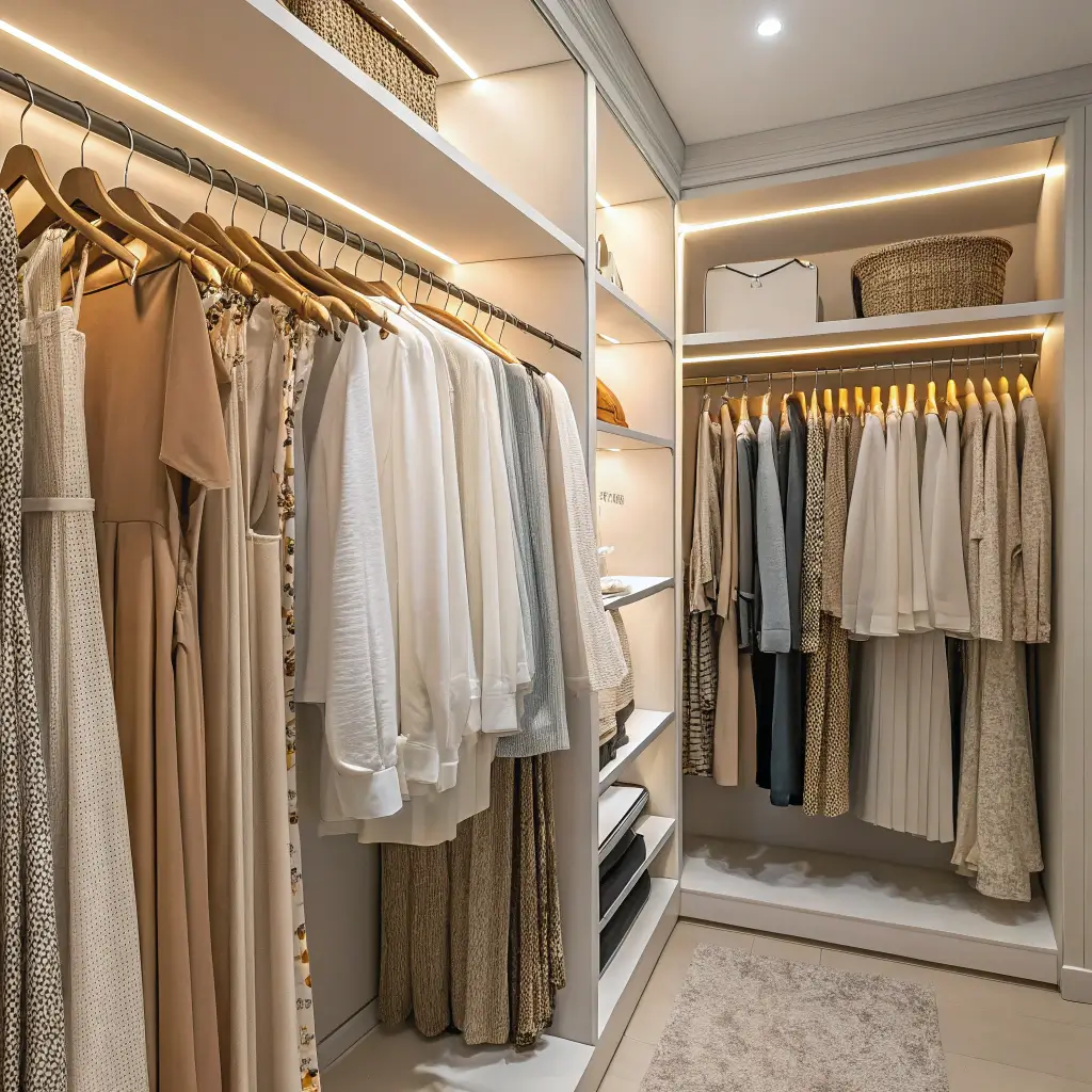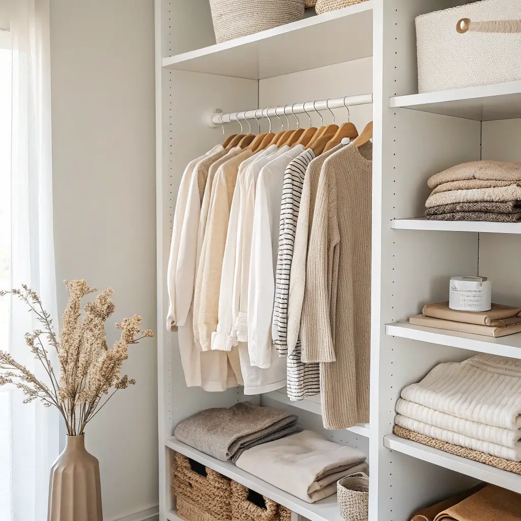 Focus on clean lines and neutral colors. White, beige, gray, and natural wood tones dominate. Your closet should feel like a calm retreat, not a carnival.