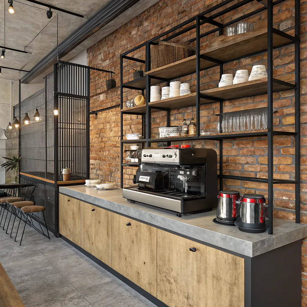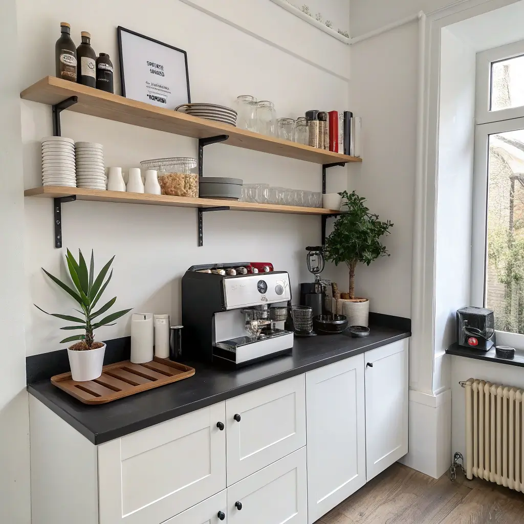 Start with a pipe shelving unit. You can DIY this for under $100 with supplies from your hardware store. Black pipes, wood planks, done. Mine holds everything from my espresso machine to my collection of international teas.