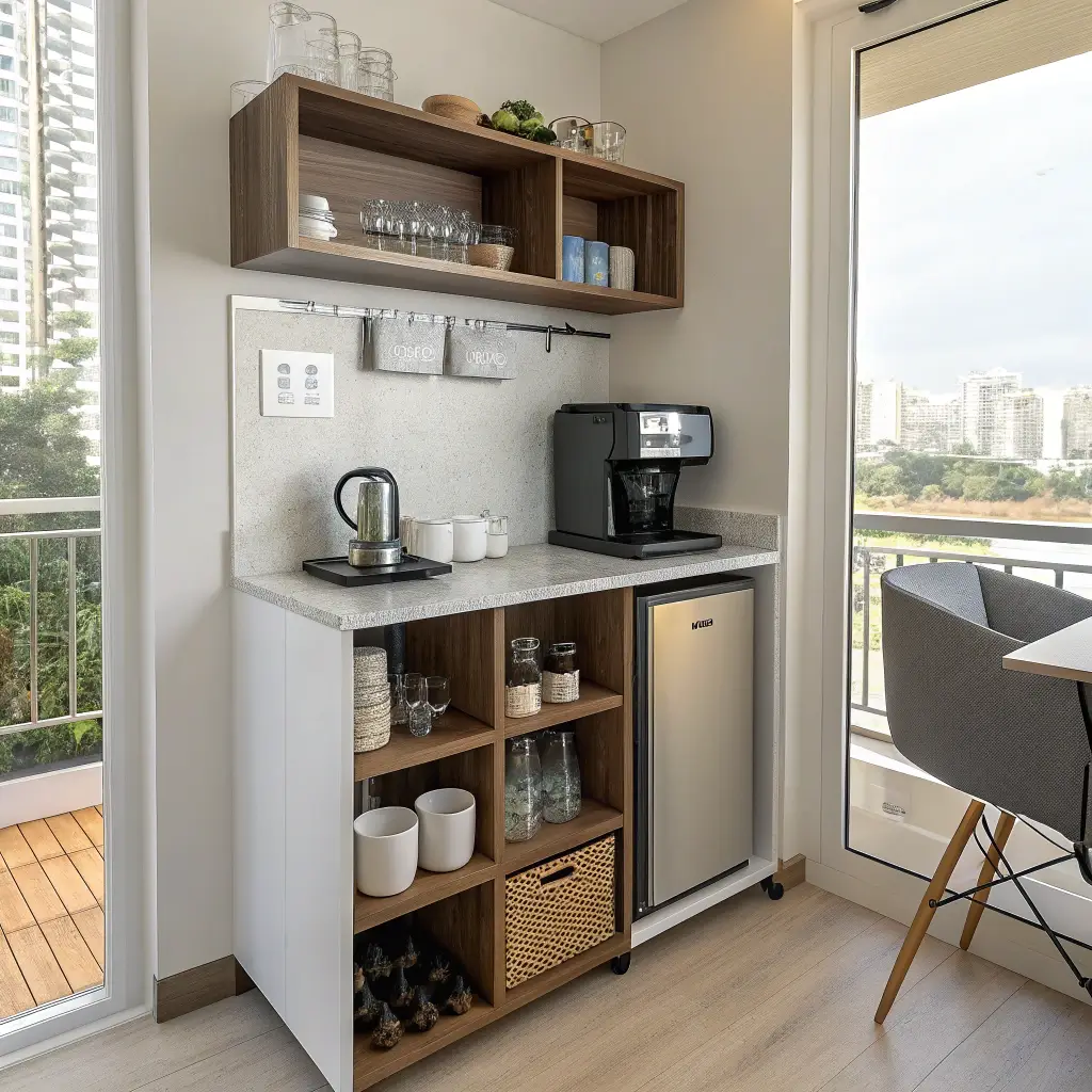 I invested in a bar cart with locking wheels. During the day, it lives in a corner. When I need coffee, I roll it out. Hosting friends? It becomes a mobile beverage station.