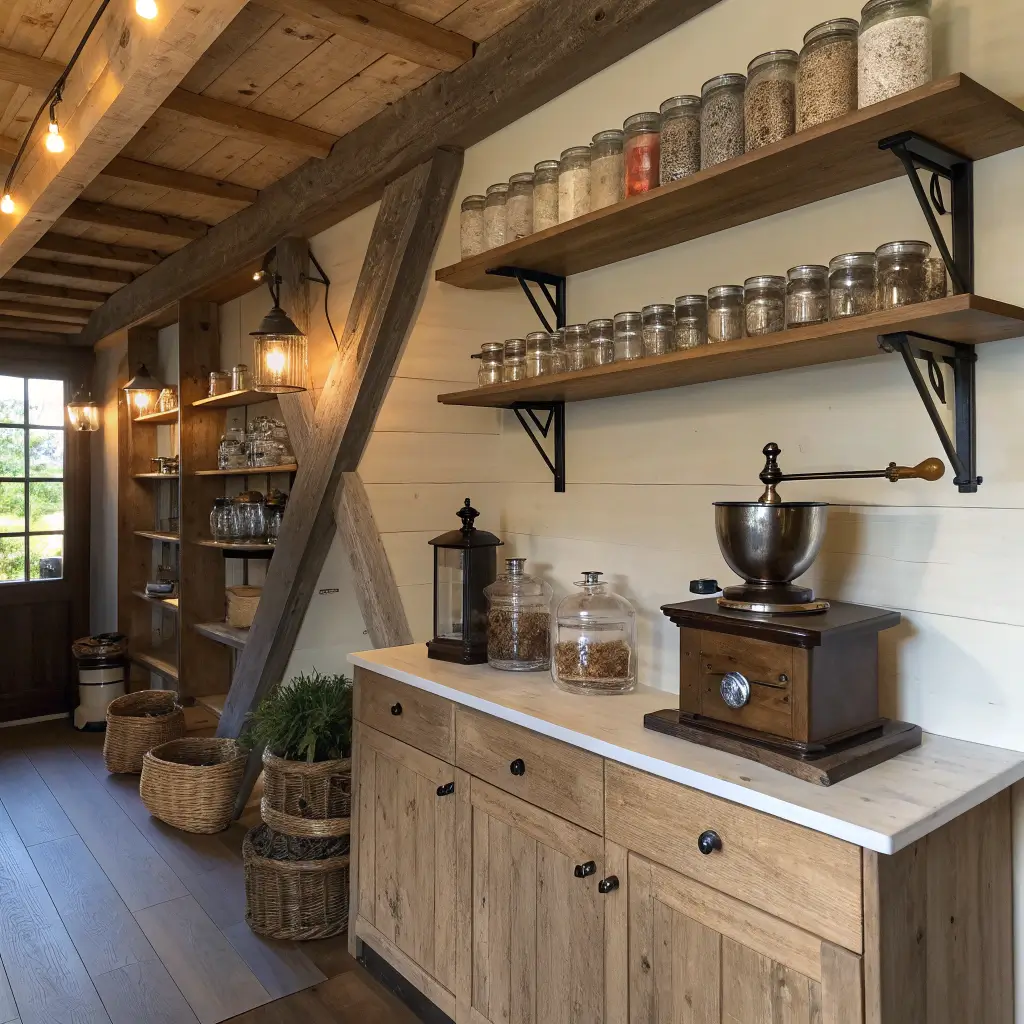 Start with reclaimed wood elements â€“ whether that’s floating shelves, a vintage sign, or an actual barn door backdrop. Mason jars become your best friends here, storing everything from coffee beans to sugar. Don’t you love how practical storage can double as decoration?